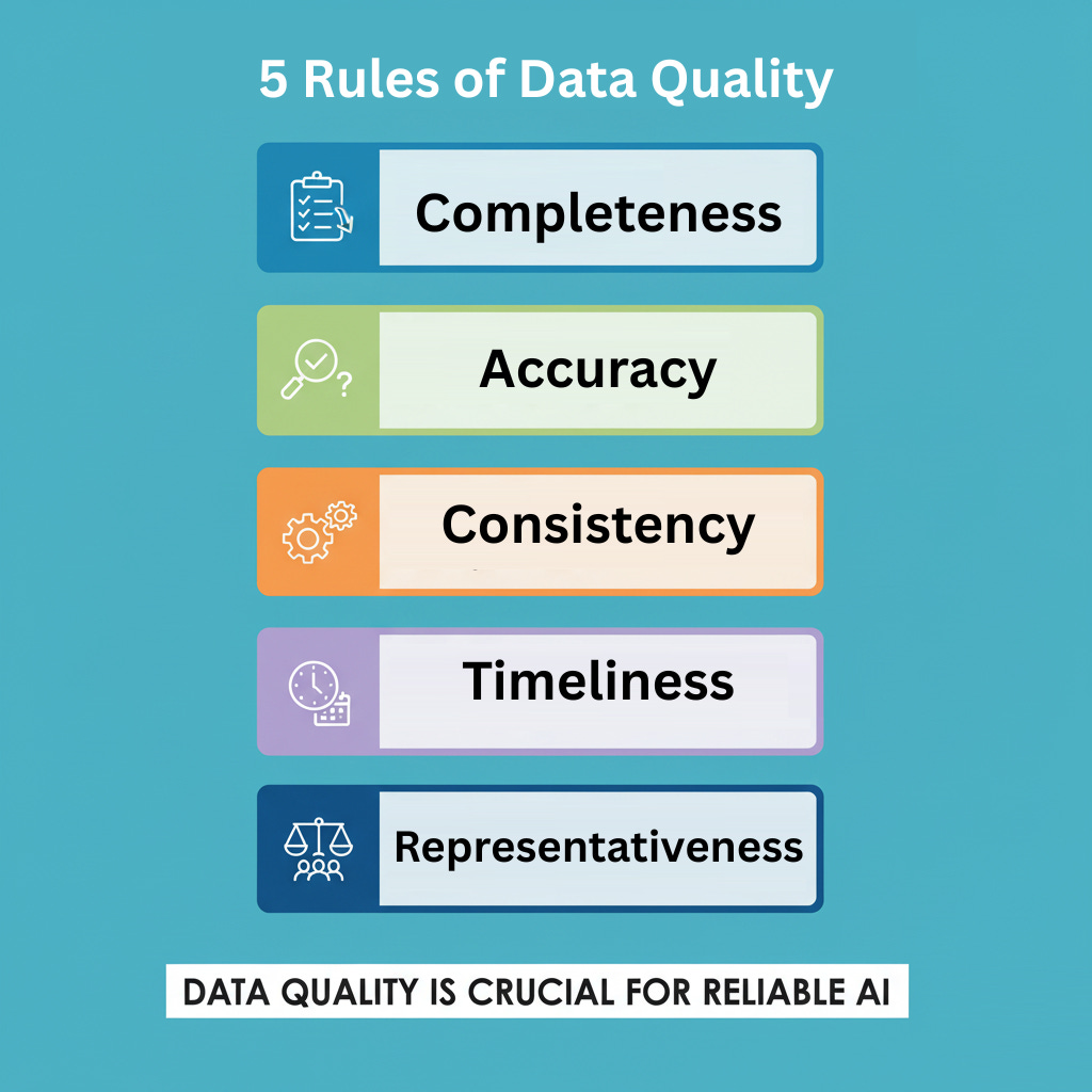 Timeliness: Old data quickly loses relevance in fast-moving domains. Set freshness requirements and automate checks for stale inputs.