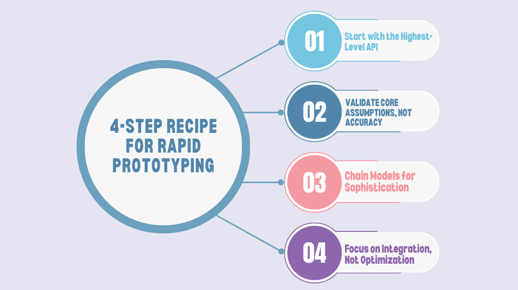 Let me share an example to illustrate the importance of rapid prototyping more effectively. A founder needed to route customer support tickets. His plan for a custom classifier would have taken months. Instead, we built a prototype in two days using GPT-3.5 to categorize tickets and a simple rules engine for routing. It was only 78% accurate, but it immediately proved the concept and revealed crucial user requirements we hadn’t considered.